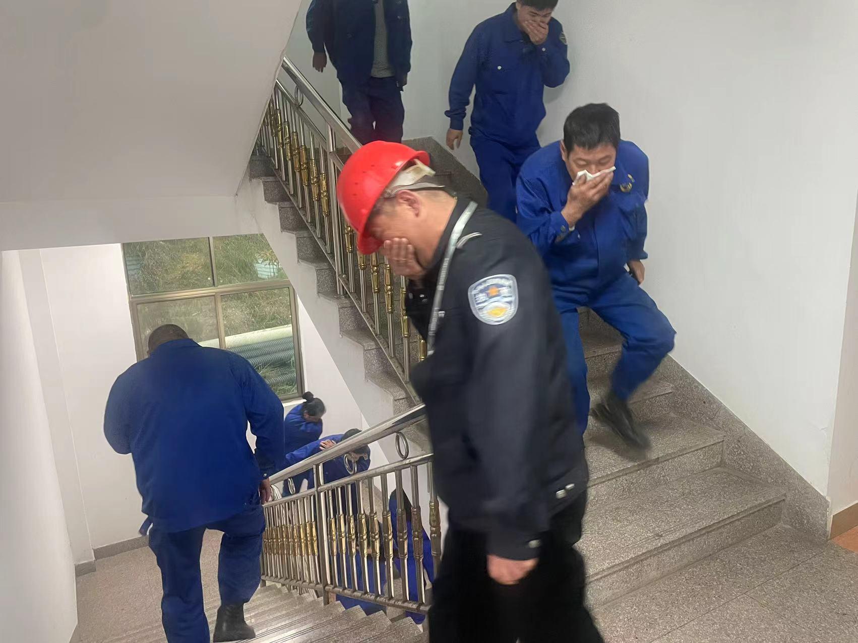 演練正式開始,模擬員工宿舍濃煙升起,火警報(bào)警聲響起,全體員工按照《消防應(yīng)急疏散預(yù)案》的要求,彎著腰,捂著口鼻,按指定安全消防通道,有序撤離至安全地點(diǎn)。