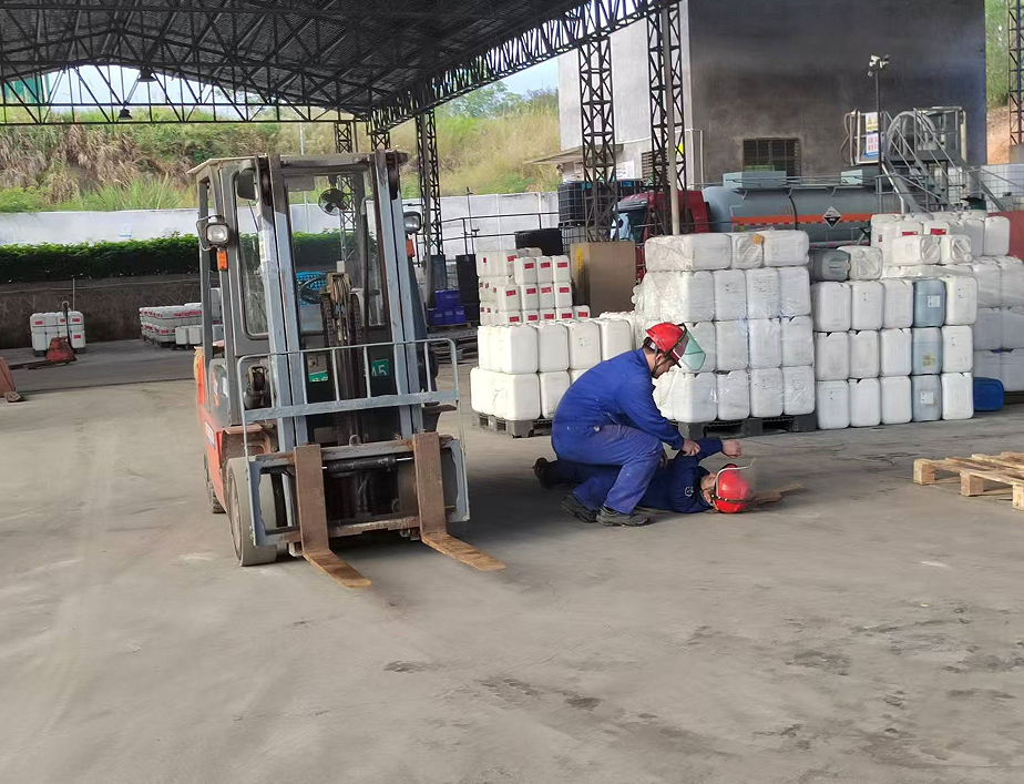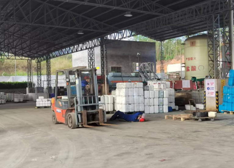 模擬三酸車間叉車司機(jī)王根滿載貨物時(shí),由于未注意周邊情況,撞到正在盤貨人員傅偉航。