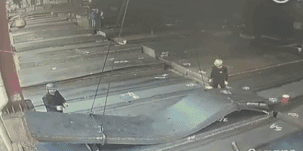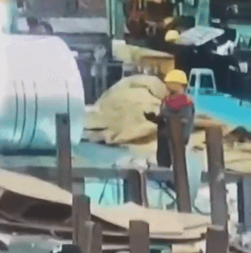 鋼板直接拍在工人頭上,安全帽直接被拍碎,保了一命。